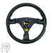 Flat 3 spoke steering wheel with black anodized spokes. Black molded polyurethane construction. Very detailed, even simulating perforated leather in hand grip areas for enhanced grip. Complete with horn button.