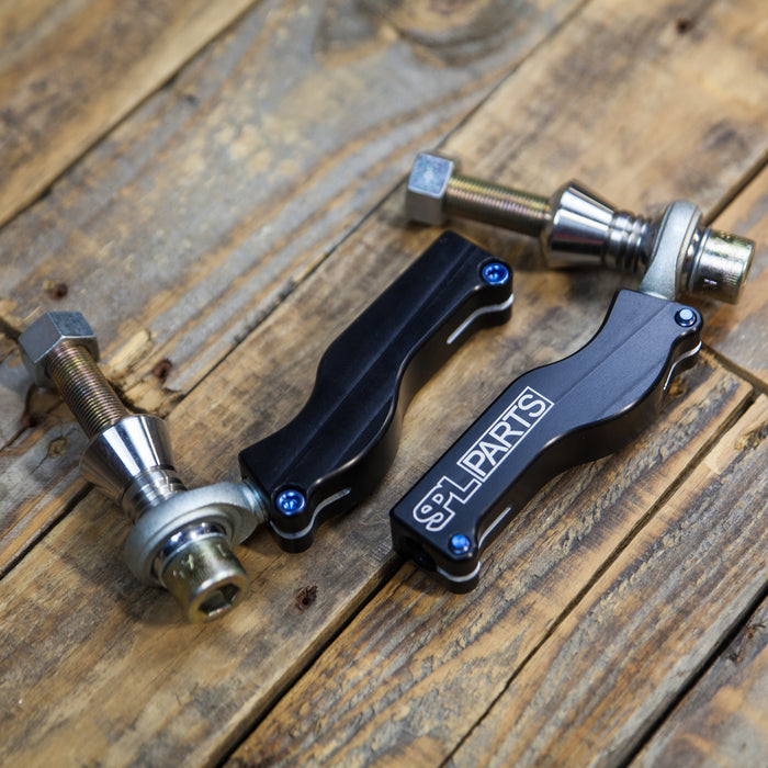 SPL Parts Front Tie Rod Ends (TRE) allow the tie rod end pivot to be relocated, which will correct bump steer resulting from modified caster or lower arm geometry, thus reducing lap times. On cars that are lowered significantly, relocating the pivot point will also keep the tie rod end from binding, thereby preventing the inner tie rods from breaking or bending when racing.